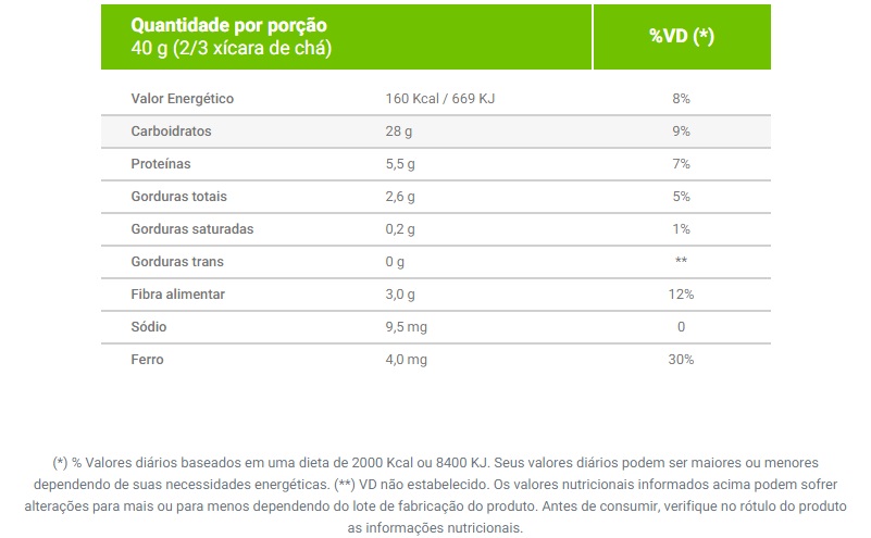 – Possui grande quantidade de vitaminas e minerais como ferro, fósforo, cálcio, vitaminas B1, B2 e B3;